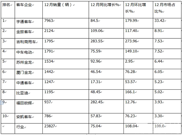 三、12月:宇通独大强势霸榜,金旅第二、吉利商用车第三;TOP10同环比均大涨;吉利商用车“双领涨”