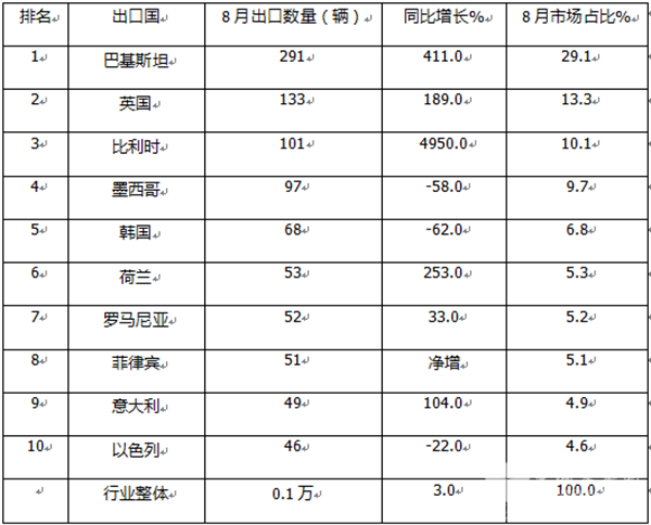 四、8月纯电动客车出口国:巴基斯坦、英国、比利时居前三;前10同比7增3降,比利时领涨