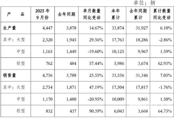 2025年10月9日,宇通客车(600066)发布公告,2025年9月份产销数据快报显示,公司在该月的生产量为4447辆,同比增加14.67%。在销售方面,2025年9月份的销售量为4756辆,同比增加25.55%。 2025年9月份产销数据详细情况如下: