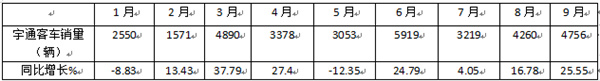 表1,根据宇通产销快报数据,2025年1-9月各月客车销量及同比: