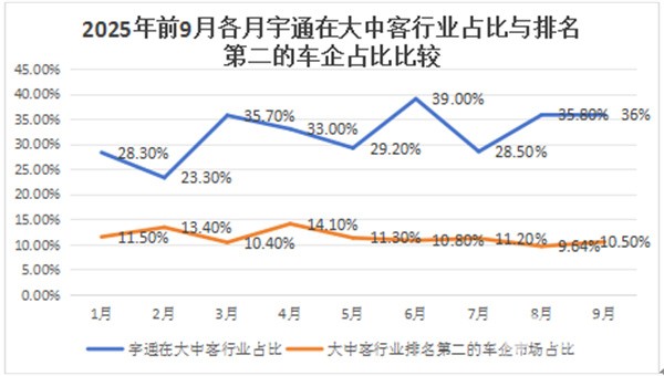 上图表可见,2025年1-9月,宇通在我国大中型客车行业的市场占比大部分月份都在3成以上,甚至接近4成,且一直都排行第一;