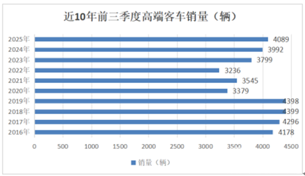 正是在上述几个因素的综合作用下,导致2025年前三季度高端客车市场同比仅呈现小幅度增长。
