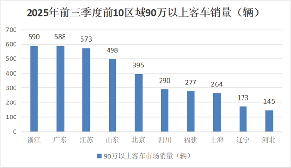 表5,2025年前三季度90万以上客车产品TOP10区域市场的销量及占比统计: