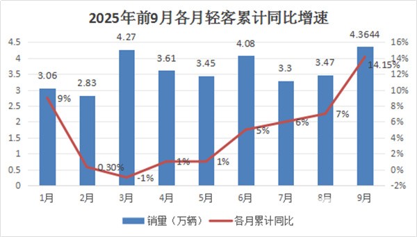 根据中汽协数据,2025年1-9月各月轻客销量及累计同比增速: