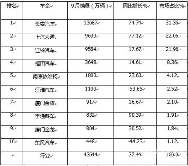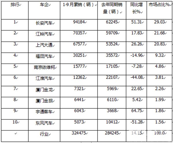 特点六、前9月累销:长安领跑;江铃、大通分列二、三,TOP10同比6增4降,宇通领涨