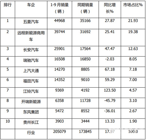 特点三、前9月累销:五菱\远程\长安居前三;前10累计同比7增3降,江铃菱领涨