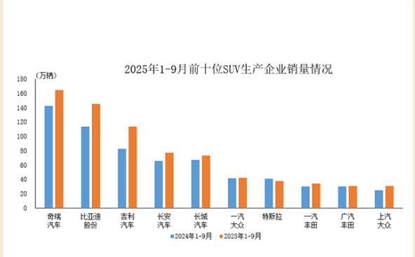 据中国汽车工业协会统计分析,2025年1-9月,销量排名前十位的SUV生产企业共销售749.6万辆,占SUV销售总量的66.5%。