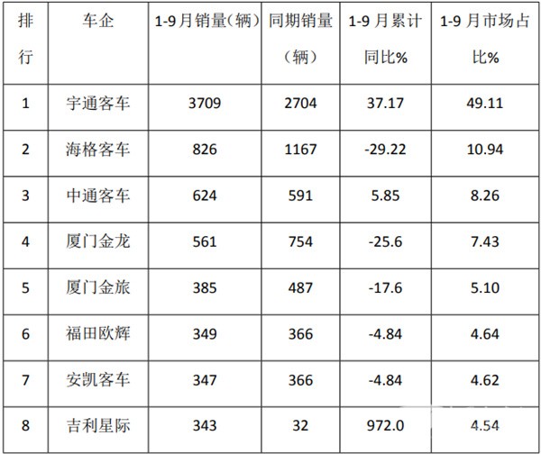 ---海格客车累计销售826辆,居第二,同比下降29.22%,跑输大盘,市场占比10.94%;;