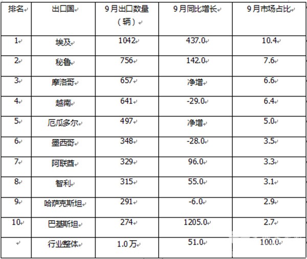 上表显示,2025年9月我国客车出口到TOP10国家中,出口数量同比及市场占比:
