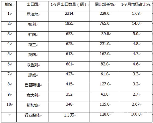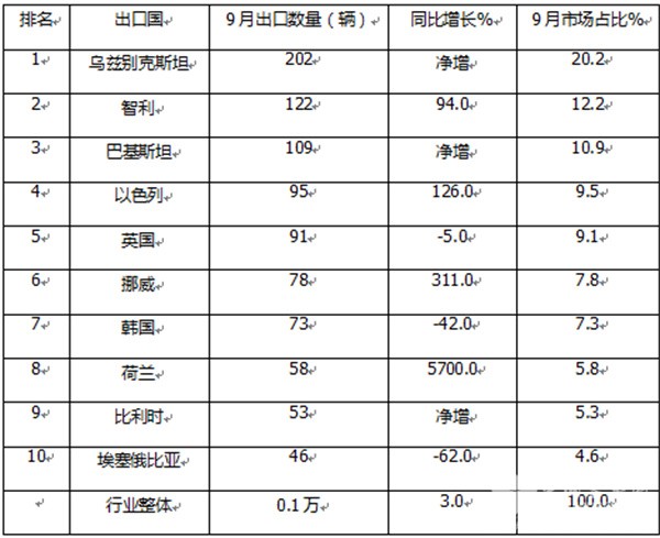 ---出口数量在100辆以上的有智利、巴基斯坦两个国家,出口同比分别增长94%和净增,均跑赢大盘,市场占比分别为12.2%和10.9%。