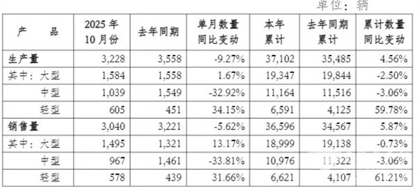 销售方面,2025年10月销量为3040辆,同比下降5.62%;本年累计销量36596辆,同比增长5.87%。其中,大型客车销量1495辆,同比上升13.17%;中型客车967辆,同比下降33.81%;轻型客车578辆,同比上升31.66%。