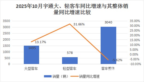 2025年1-10月宇通累计销量中,大型客车累销18999辆,同比下降0.73%;中型客车累销10976辆,同比下降3.06%;轻型客车累销6621辆,同比上升61.21%。