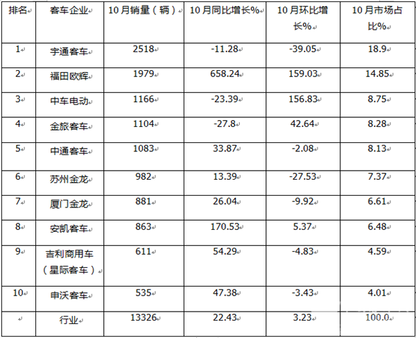 表1,根据中国客车统计信息网数据,2025年10月6米以上客车top10销量排行及同环比、市场占比:
