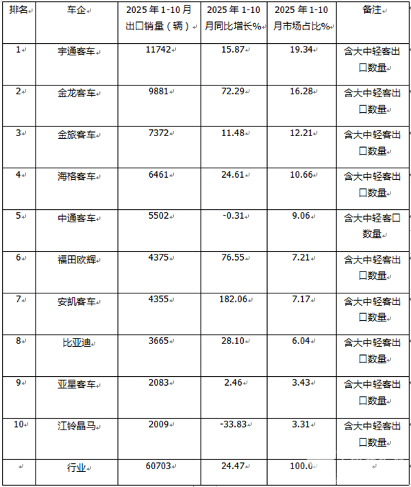 表1,根据中国客车统计信息网数据,2025年10月客车出口TOP10排行: