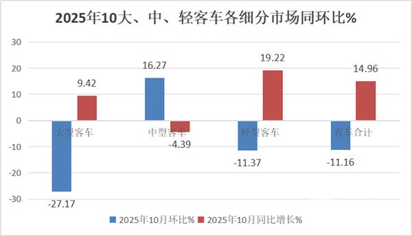 从占比看,大、中、轻客车占据2025年10月客车总销量的比例分别为11.09%、11.09%和77.82%;