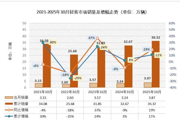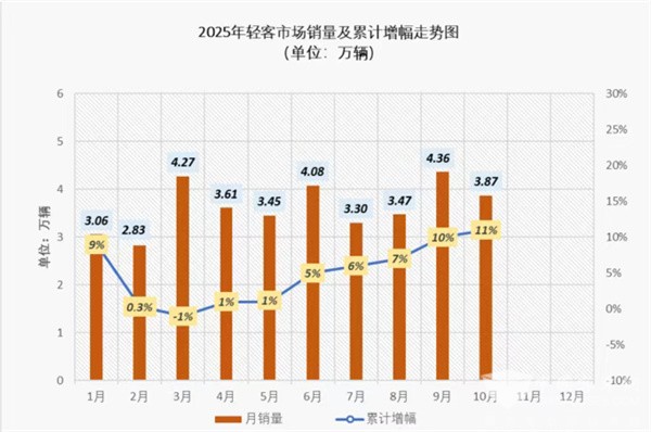 2025年1-10月轻客累计销售36.3万辆,累计同比增11.11%。