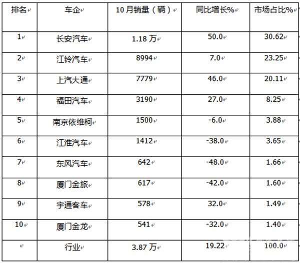特点六、前10月累销:长安领跑;江铃、大通分列二、三;TOP10同比5增5降,宇通领涨