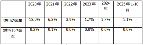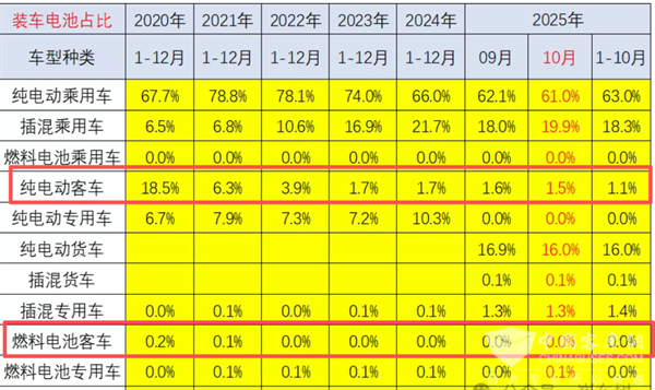 ---燃料电池客车动力电池装机量占据新能源汽车大盘的比例很少,从2020年的0.2%占比下降到2021年的0.1%占比,然后从2022年到2025年前10月占比均为零;