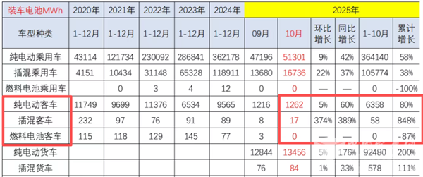 2025年10月我国新能源客车动力电池装机量为1279MWh(将截图2中2025年10月份的纯电动客车装车量1262MWh+2025年10月的插电式混动客车装车量17MWh+2025年10月的燃料电池客车的装车量0MWh) ,同比增长大约70%;2025年前10月新能源动力电池累计装机量大约为6416MWh(将截图2中2025年1-10月份的纯电动客车装车量6358MWh+2025年1-10月的插电式混动客车装车量58MWh+2025年1-10月的燃料电池客车的装车量0MWh),同比增长近85%。
