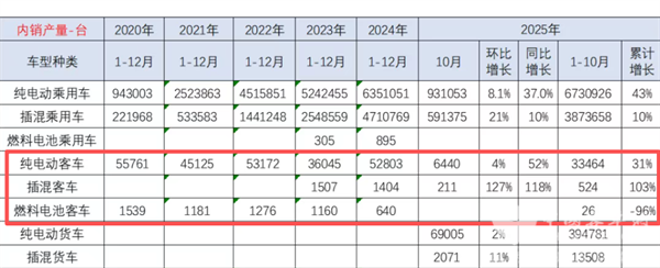 根据中国汽车流通协会数据(见截图1),2025年10月我国新能源客车产量为6651辆(含电动客车6440辆+插电式混动客车211辆+0辆燃料电池客车,不含新能源物流客车,下同),同比增56%;2025年前10月新能源客车累计产量为34014辆(含纯电动客车33464辆+插混客车524辆+26辆燃料电池客车),累计同比增长35%。