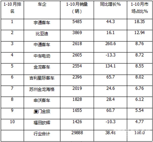---宇通、比亚迪累计销量均超出3000辆共同领跑行业(分别销售5485辆和3896辆),分别居第一、第二,市场占比分别为18.35%、12.94%;