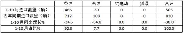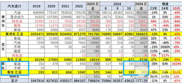 截图5,2024年10月及1-10月各种动力客车进口数量(数据来源:中国汽车流通协会)