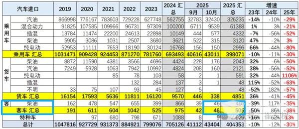 截图4,2025年10月及1-10月各种动力客车进口数量(数据来源:中国汽车流通协)