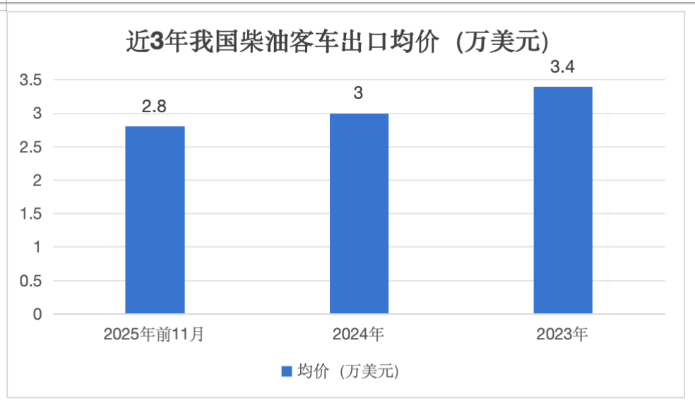 根据中国汽车流通协会数据,2025年前11月我国客车累计出口9.2万辆,同比增长25%,整体出口每辆均价为6.8万美元,同比去年的6.6万美元提升了近3%,比前年的6.3万美元提高了近8%。可见近3年来我国客车出口的均价呈现了逐年上升态势。 下