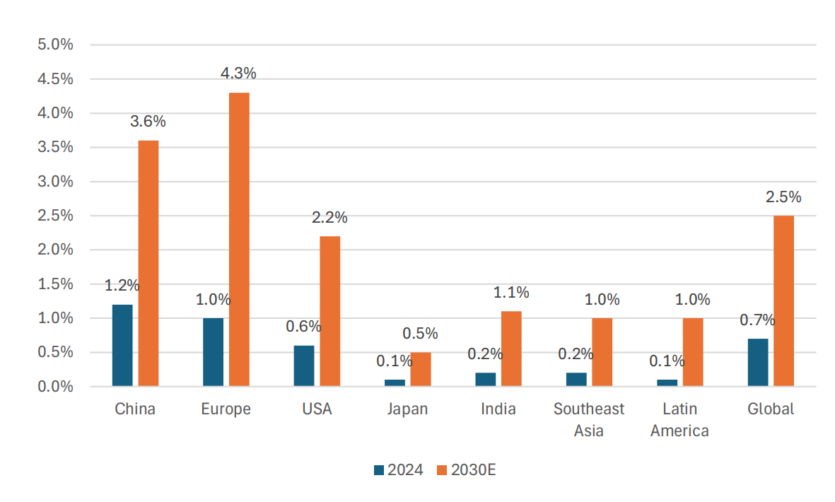 个中缘由,高盛的报告提及一个关键因素。全球纯电动汽车(BEV)的电力消耗量预计将从2024年的0.7%增长至2030年的2.5%。即便新售纯电动汽车数量趋于平稳,实际在用纯电动汽车数量仍保持着两位数的高速增长。