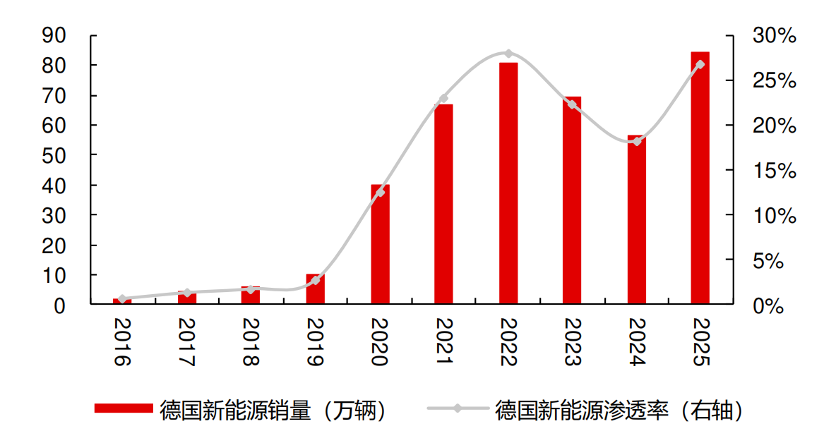 2024年,德国新能源汽车销量跌至谷底,2025年有所上升,与中国电动汽车大量进入德国市场有密切关系。2025年比亚迪在德国销量超越特斯拉,成为欧洲最大电动车市场德国的领跑者。上汽名爵、极氪等品牌通过高性价比和本土化策略也提升市占率。2025年,中国品牌在欧洲电动车市场份额攀升至12.8。