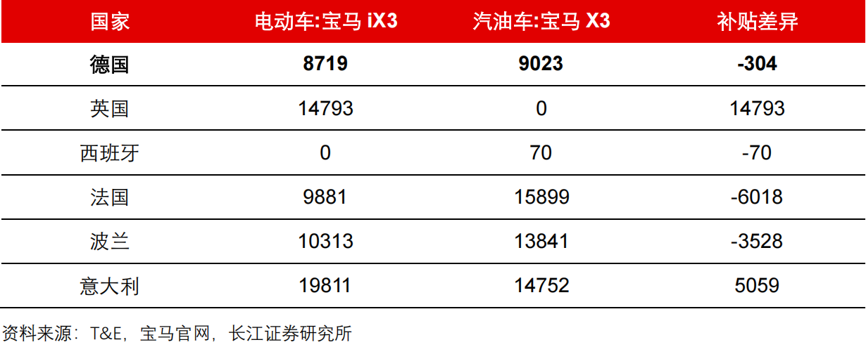 长江证券的报告举例了宝马旗下产品油车与电动汽车补贴差异的情况,从数据中不难看出,油车宝马X3的补贴高于宝马iX3。除了意大利之外,其他国家均如此,油车的补贴高于新能源汽车。在利益的驱使下,车企的积极性有多高呢?