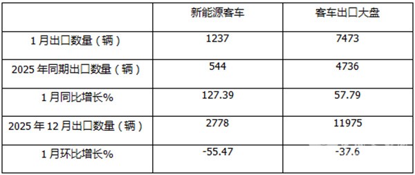 根据中国客车统计信息网统计数据,2026年1月我国新能源客车出口1237辆,同比呈现127.39%的翻倍大涨,环比呈现55.47%的下降幅度,可见环比降幅也不小。